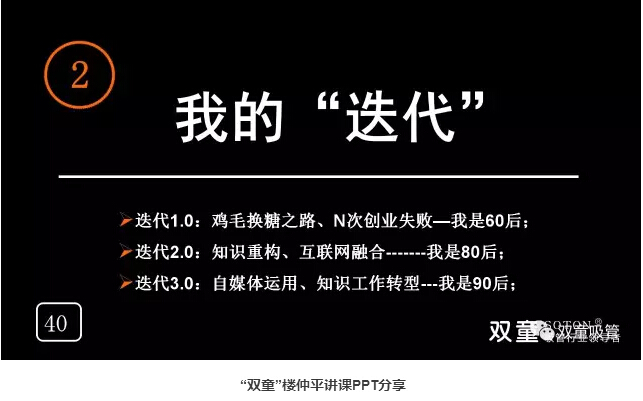 我的“迭代”:“雙童”樓仲平通過自身不斷的學(xué)習(xí):在浙大學(xué)習(xí)進(jìn)修、學(xué)習(xí)電腦設(shè)計,認(rèn)知到自媒體作用,與年輕人鏈接、培養(yǎng)團(tuán)隊,自己轉(zhuǎn)變教育工作……不斷否認(rèn)自我、重新認(rèn)知,實(shí)現(xiàn)迭代!