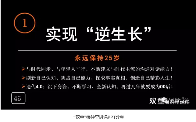 實(shí)現(xiàn)“逆生長”:“雙童”樓仲平通過不斷的到各地演講寫課件鍛煉自己,嘗試新的突破,喜歡挑戰(zhàn)新的東西,永遠(yuǎn)將自己定位在25歲,不斷學(xué)習(xí)去認(rèn)知新的世界,去擁抱這個高速變化的世界,從而影響團(tuán)隊并保持“雙童”不被淘汰。最后,樓總也鼓勵所有在座的創(chuàng)業(yè)者不能老去,要與時代保持同步,接受不斷變化和挑戰(zhàn),迎合這個高度變化的世界!