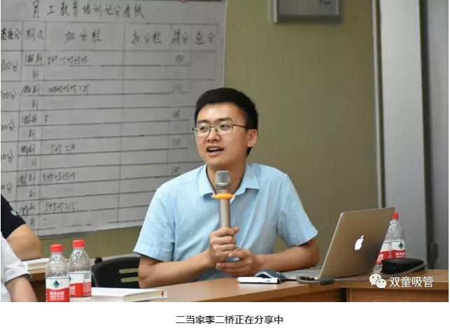 2003年11月,李二橋被任命為吸管車間班組長,負責(zé)吸管車間六七十號員工的生產(chǎn)安排和質(zhì)量控制。由于工作出色,2005年8月,剛滿20歲的李二橋就進入“雙童”中層行列,被任命為品管部主任,開始承擔(dān)起標(biāo)準(zhǔn)化制定的工作。