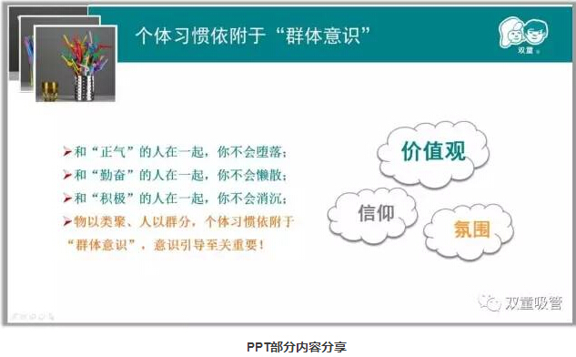 在企業(yè)中,管理的最高境界是自律,而自律就需要每個人改變自己,繼而形成高度統(tǒng)一的群體意識。因此,所有人的習慣都和企業(yè)有很大的關(guān)系,物以類聚、人以群分,個體習慣依附于群體意識,意識引導至關(guān)重要!