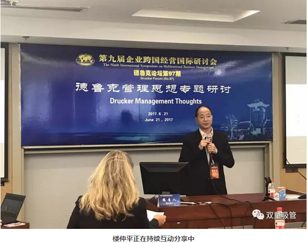 6月21日,樓仲平受邀參加由南京大學(xué)商學(xué)院主辦的跨國經(jīng)營國際論壇——德魯克管理思想專題研討,和南京大學(xué)商學(xué)院名譽(yù)院長趙曙明教授、美國德魯克管理學(xué)院校友關(guān)系助理主任 Shaheen PLUNIER女士同臺做主題分享!