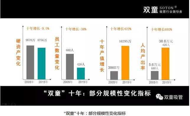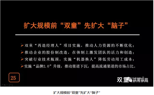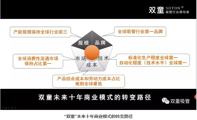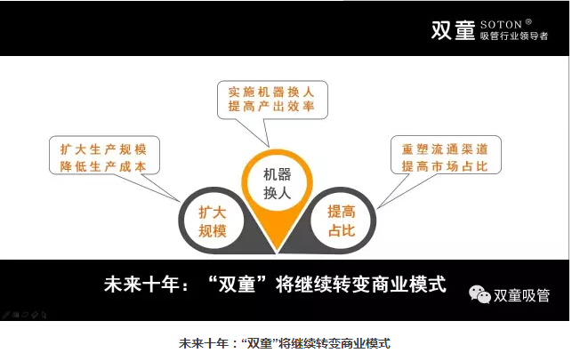 所以,未來十年,“雙童”將繼續(xù)轉(zhuǎn)變商業(yè)模式,在規(guī)模上保持適量擴(kuò)張,實(shí)施機(jī)器換人提高產(chǎn)出效率,重塑流通渠道,提高市場占比。