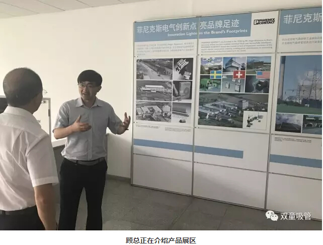 在顧總的帶領下,“雙童”樓仲平和李二橋參觀了菲尼克斯的文化展區(qū)和產品展區(qū)。并在此過程中,顧總詳盡地向二位介紹了菲尼克斯在中國的創(chuàng)始過程、中國市場的開拓以及菲尼克斯在全球的產業(yè)分布。