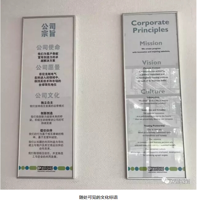 通過PPT介紹,我們了解到菲尼克斯獨特的企業(yè)文化價值觀,秉承“獨立自主、創(chuàng)新創(chuàng)造和信任伙伴”的企業(yè)文化,經過中國公司二十三年的歲月沉淀,融入了中國優(yōu)秀的傳統(tǒng)文化和中國團隊的智慧,中西合璧、兼收并蓄。我們發(fā)現(xiàn),菲尼克斯的企業(yè)文化價值觀與“雙童”高度趨同: