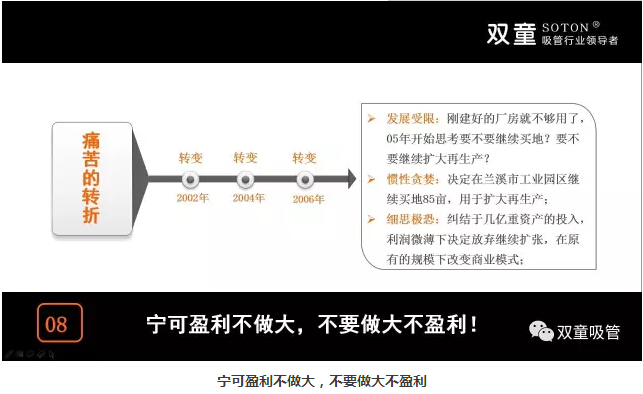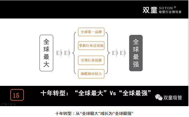 “于是,‘雙童’這些年也在不斷的轉(zhuǎn)型,實(shí)施小客戶原則,塑造品牌,制定行業(yè)標(biāo)準(zhǔn),國(guó)家標(biāo)準(zhǔn)乃至于國(guó)際標(biāo)準(zhǔn),牢牢抓住行業(yè)的話語(yǔ)權(quán),從‘全球最大’成長(zhǎng)為‘全球最強(qiáng)’。”