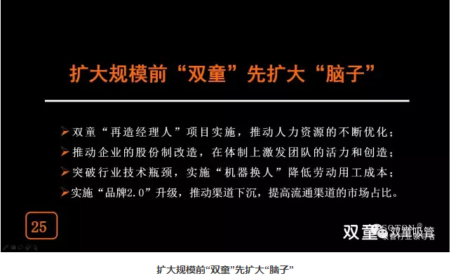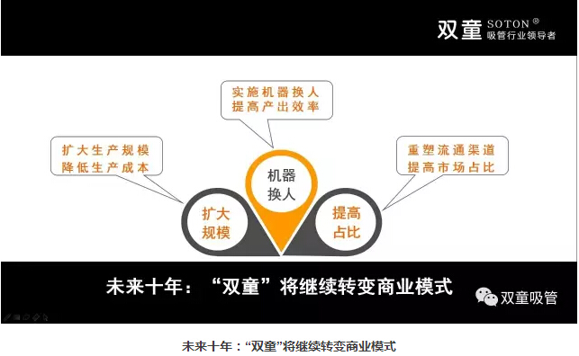 未來(lái)十年,“雙童”將繼續(xù)轉(zhuǎn)變商業(yè)模式,在規(guī)模上保持適量擴(kuò)張,實(shí)施機(jī)器換人提高產(chǎn)出效率,重塑流通渠道,提高市場(chǎng)占比!“適當(dāng)?shù)囊?guī)模”未必跟硬資產(chǎn)規(guī)模、產(chǎn)值、員工數(shù)成正比,不同行業(yè)對(duì)企業(yè)“適當(dāng)?shù)囊?guī)模”應(yīng)該有不同的認(rèn)知和判斷,根據(jù)企業(yè)經(jīng)營(yíng)“時(shí)間軸”變化做相應(yīng)調(diào)整來(lái)改變“雙童”未來(lái)在行業(yè)當(dāng)中的地位!