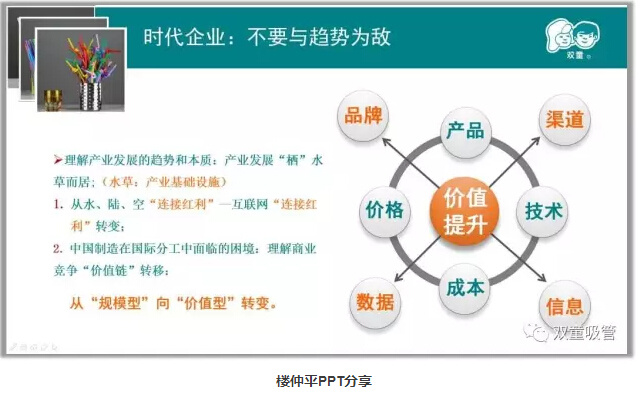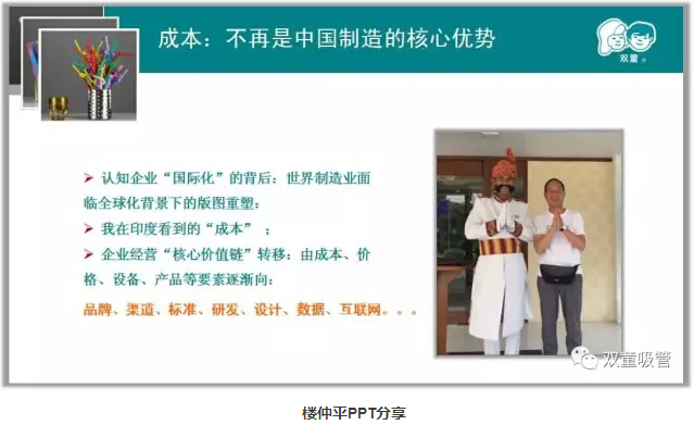 首先,“雙童”樓仲平分享了在全球化的背景下,成本不再是制造業(yè)的核心優(yōu)勢。企業(yè)必須面對時代的不斷變化,產(chǎn)業(yè)發(fā)展“棲”水草而居,中國制造商業(yè)競爭“價值鏈”轉(zhuǎn)移逐漸從“規(guī)模型”向“價值型”轉(zhuǎn)變。