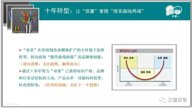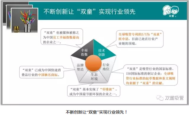 “雙童”的這些改變實際上是商業(yè)模式的創(chuàng)新,基于商業(yè)價值和產(chǎn)業(yè)鏈進行創(chuàng)新。除了商業(yè)模式的創(chuàng)新之外,另一方面,“雙童”的創(chuàng)新都來源于基層和實踐,員工們每天都在想吸管除了喝飲料還能干什么,結(jié)合基層和實踐來獲得靈感。目前,我們發(fā)明了愛心吸管、卡通吸管、風車吸管、音樂吸管、眼鏡吸管等創(chuàng)新吸管,擁有了100多項專利,掌握了全球吸管行業(yè)近2/3的專利,并且主導著全球吸管行業(yè)的行業(yè)標準制定。