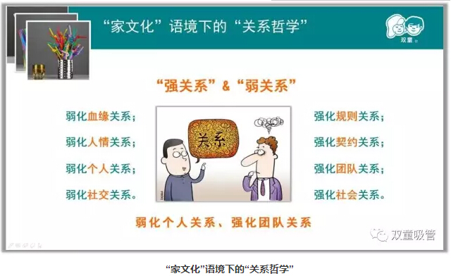 第一:要弱化血緣關(guān)系,強(qiáng)化規(guī)則關(guān)系。“雙童”雖然倡導(dǎo)“家文化”,鼓勵(lì)員工在企業(yè)安家,幾百號(hào)員工都以家庭的形式存在,但是我們也制定了各種各樣的規(guī)范政策,甚至出臺(tái)了親屬回避制度,以規(guī)則來(lái)制定關(guān)系,指導(dǎo)員工的行為操作。這樣一來(lái),企業(yè)把血緣關(guān)系弱化,從而建立非常規(guī)范的規(guī)則關(guān)系。