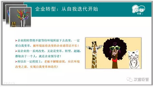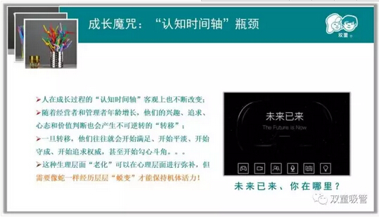 其實,經(jīng)理人老化更多所指是心理層面的老化,而人的心理年齡是可以通過推動、學習、認知而改變的,而領導者的責任就是要推動經(jīng)理人逆生長。雙童在每周一和周三的19-21點,舉辦全體員工的學習會,確保所有員工每月有累計8小時的學習和培訓;將員工的學習與職業(yè)升遷掛鉤,讓每個員工不斷學習和認知到新事物。