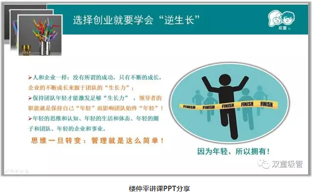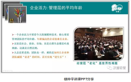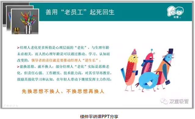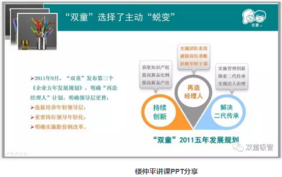 通過樓仲平個人的迭代,也促進了雙童團隊的蛻變,推動團隊向年輕化、知識化和信息化轉(zhuǎn)變。20119月,雙童發(fā)布了第二個《企業(yè)五年發(fā)展規(guī)劃》,明確再造經(jīng)理人計劃,明確領導層更替:選拔培養(yǎng)年輕領導層、重要崗位領導年輕化、明確實施股份制改革,慢慢解決管理層老化問題!重組后的雙童團隊平均年齡不到三十歲,大部分核心團隊的工齡在十年以上,學歷、知識層次和忠誠度大幅提高!