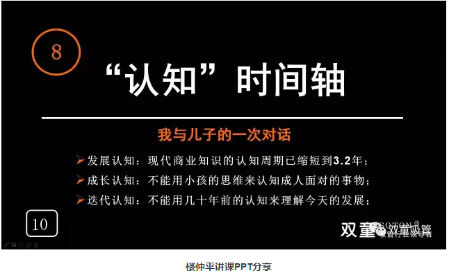 “認(rèn)知”時間軸:“雙童”樓仲平通過自己與兒子的一次對話認(rèn)知到不能用慣性思維來認(rèn)知我們的下一代。樓仲平的成長也伴隨著不斷的否定,在認(rèn)知、糾錯、不斷改變下實現(xiàn)自我成長。“創(chuàng)業(yè)者”最應(yīng)該有“時間軸”的概念,需要擁有自我蛻變的能力,否則你就很難成長!