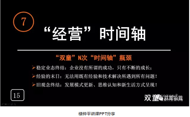 “經(jīng)營”時間軸:樓仲平也用“雙童”的發(fā)展史告訴大家經(jīng)營也是有時間軸的,會遇到瓶頸和“天花板”。企業(yè)沒有所謂的成功,只有不斷的成長,我們無法用既有經(jīng)驗和技術(shù)解決所遇到所有問題!