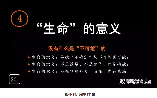 “生命”的意義:“雙童”樓仲平通過自己的經(jīng)歷告訴大家沒有什么是不可能的:沒人設(shè)計節(jié)能降耗,就自己學(xué)設(shè)計,在樊登讀書會金華分會周年慶促銷活動時,樓仲平用六個小時爭取到58個會員。我們要選擇自己想要的方式選擇自己的人生,千萬不要抱怨,抱怨是最大的瓶頸!生命的意義在于尋找“不確定”,從不可能到可能,在于不斷地挑戰(zhàn)和內(nèi)在修煉!