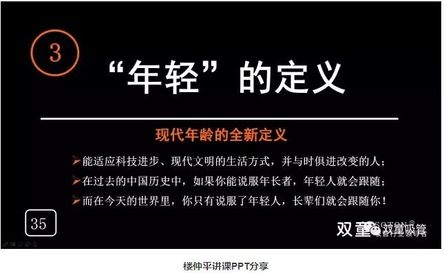 “年輕”的定義:能適應(yīng)現(xiàn)代全新的生活方式,并與時俱進的人就是年輕人!在過去的中國歷史中,如果你能說服年長者,年輕人就會跟隨;而在今天的世界里,你只有說服了年輕人,長輩們就會跟隨你!