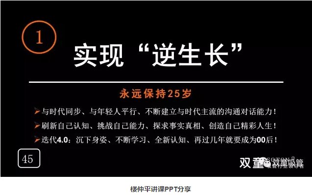 實現(xiàn)“逆生長”:“雙童”樓仲平通過不斷的到各地演講寫課件鍛煉自己,嘗試新的突破,喜歡挑戰(zhàn)新的東西,永遠(yuǎn)將自己定位在25歲,不斷學(xué)習(xí)去認(rèn)知新的世界,去擁抱這個高速變化的世界,從而影響團隊并保持“雙童”不被淘汰。最后,樓總也鼓勵在座的企業(yè)主們不能老去,要與時代保持同步,接受不斷變化和挑戰(zhàn),迎合這個高度變化的世界!