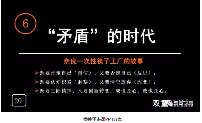 “矛盾”的時代:“雙童”樓仲平通過日本奈良一次性筷子的故事告訴大家成也工匠精神、敗也工匠精神,沒有改變,“工匠”精神也沒有用。作為創(chuàng)業(yè)者來講,我們不能用過往的經(jīng)驗來理解發(fā)生的一切,否則你會被時代所拋棄。在不同的時代,你對時間和技術(shù)進步的理解是不一樣的,既要肯定自己、又要否定自己;既要認知積累、又要清空放棄;既要工匠精神、又要創(chuàng)新轉(zhuǎn)變!