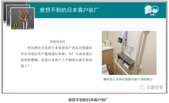“雙童”的廁所革命源于一次驗(yàn)廠事故:2002年9月,“雙童”花了兩年時(shí)間之久開發(fā)的日本優(yōu)質(zhì)客戶要對公司生產(chǎn)現(xiàn)場進(jìn)行審核。為此,“雙童”進(jìn)行了全廠大動員,把當(dāng)時(shí)北苑路3號租用廠房的里里外外都打掃得干干凈凈!終于,日本客戶到了,樓仲平在辦公室里等了許久卻被告知:日本客戶上個(gè)廁所后就不辭而別了!事后公司才了解到,原來,日本人最注重的就是廁所衛(wèi)生,而當(dāng)時(shí)“雙童”是租用的廠房廁所硬件條件有限,他們認(rèn)為一個(gè)連廁所都不干凈的企業(yè)做不出高品質(zhì)的產(chǎn)品!