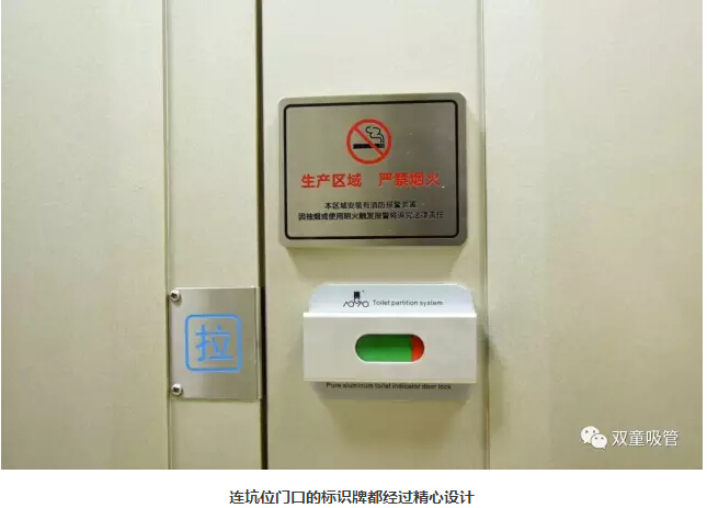 除此之外,“雙童”的衛(wèi)生間內(nèi)還有許多提示引導(dǎo)的標(biāo)示牌,每個(gè)配件都極為精致!在洗手區(qū),俯身洗手時(shí),你會看見墻面上溫馨的提示語:“洗手臺盆,保持清潔;請勿將大量的水濺出臺盆濺濕地面”;每扇門上都會有“生產(chǎn)區(qū)域,嚴(yán)禁吸煙”的標(biāo)識,每個(gè)蹲位后面都有“便后請沖水、素養(yǎng)高低往往體現(xiàn)在關(guān)上門自己獨(dú)處之時(shí)”的溫馨提示,引導(dǎo)員工提升素質(zhì)!