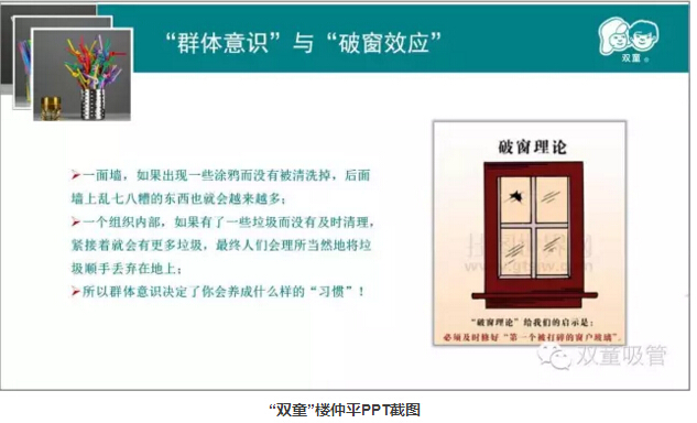 個(gè)體習(xí)慣依附于“群體意識”,環(huán)境會潛移默化地影響員工的素養(yǎng),環(huán)境不好則會產(chǎn)生破窗效應(yīng)。比如一個(gè)素養(yǎng)再差的農(nóng)民工,到了“雙童”這樣好的企業(yè)環(huán)境中工作和生活,習(xí)慣也會慢慢變好,整體素養(yǎng)也會得到有效提升。