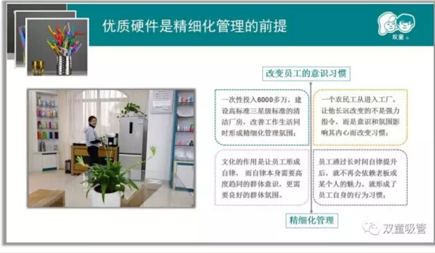 而優(yōu)質(zhì)硬件是精細(xì)化管理的前提,所以我們給員工使用五星級洗手間并不是有錢沒地花,而是給員工用五星級的硬件,引導(dǎo)員工改變自身的思維和行為方式,讓員工關(guān)注細(xì)節(jié)!“雙童”廁所革命的背后是“雙童”品質(zhì)追求的“人心和良心”,唯有員工的思想轉(zhuǎn)變了,生產(chǎn)的產(chǎn)品才能讓客戶放心!親,你們明白了嗎?