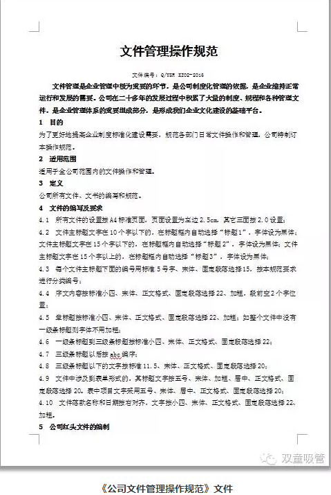 通過這份文件,我們統(tǒng)一了企業(yè)文件的編寫要求,從而明確指導(dǎo)各部門在形成、修訂、補充和更新文件時的統(tǒng)一規(guī)范!換句話說,無論是“雙童”多少位科室員工寫的文件,打開一看都像是一個人寫的文件!