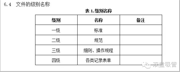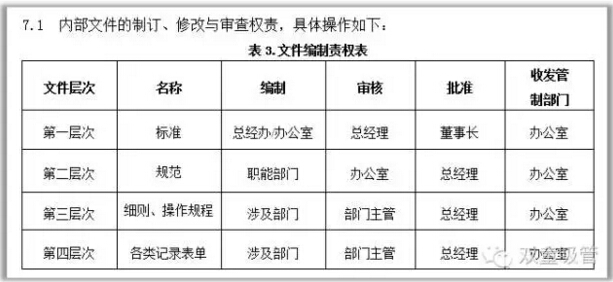 第三層次文件:管理細則、操作規(guī)程、技術(shù)標(biāo)準(zhǔn)等作為各部門運行管理活動的常用實施細則:包括管理標(biāo)準(zhǔn)、操作流程、技術(shù)標(biāo)準(zhǔn)(國家標(biāo)準(zhǔn)、行業(yè)標(biāo)準(zhǔn)、企業(yè)標(biāo)準(zhǔn)及作業(yè)指導(dǎo)書)等;