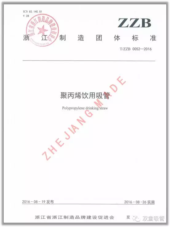2016年4月28日,《聚丙烯飲用吸管》浙江制造團體標(biāo)準(zhǔn)正式立項,并由“雙童”承擔(dān)編制起草工作。2016年8月26日,《聚丙烯飲用吸管》浙江制造團體標(biāo)準(zhǔn)正式發(fā)布實施。“雙童”成為了吸管行業(yè)首家通過產(chǎn)品認(rèn)證的企業(yè)。這標(biāo)志著“雙童”產(chǎn)品質(zhì)量達到國內(nèi)一流、國際先進又一強有力證明,為推動浙江制造品牌建設(shè)起到了良好的推動及帶頭作用。