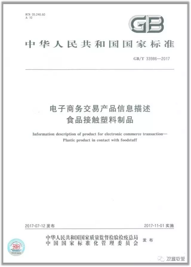 2014年11月3日,由“雙童”主導(dǎo)起草的《電子商務(wù)交易產(chǎn)品信息描述 食品接觸塑料制品》國家標(biāo)準(zhǔn)正式立項,并于2016年3月于北京通過專家評審,2017年正式發(fā)布,標(biāo)準(zhǔn)號GB/T 33986-2017,該標(biāo)準(zhǔn)的發(fā)布實施,標(biāo)志著“雙童”在標(biāo)準(zhǔn)戰(zhàn)略工作中由起草單一的產(chǎn)品技術(shù)標(biāo)準(zhǔn)向系統(tǒng)的信息應(yīng)用標(biāo)準(zhǔn)轉(zhuǎn)變,為中小企業(yè)參加國家標(biāo)準(zhǔn)的起草工作樹立了一個新的方向。