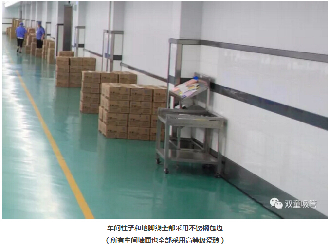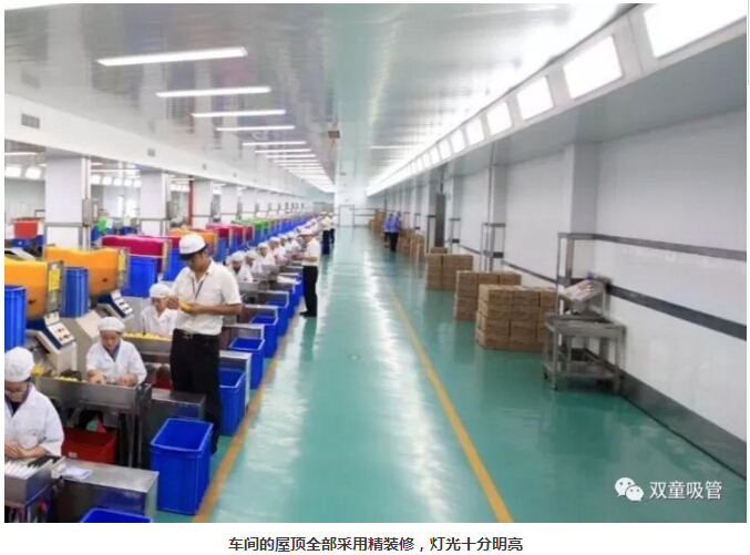 “雙童”車間的每個入口,有著許多安全、衛(wèi)生提示的標牌,引導(dǎo)員工門在進入車間時要注意安全和衛(wèi)生防護工作。進入車間內(nèi)部,一列列整齊的機器、一箱箱五顏六色的吸管、一條條清晰分明的分界線,車間內(nèi)全部安裝了恒溫空調(diào),屋頂全部進行精裝修寬敞明亮,柱子和地腳線用不銹鋼進行包邊,大大增加了建筑年限。所有員工皆穿著潔白的工作服,正在忙碌地進行生產(chǎn)工作。