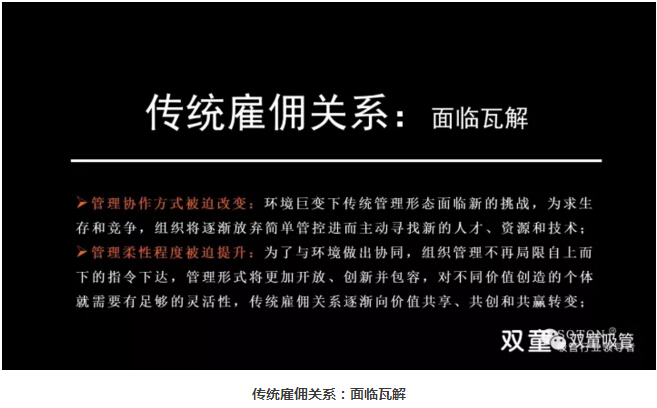 在新時代背景下,管理進入了信息管理時代,組織管理逐漸扁平化,員工管理逐漸互聯(lián)化,員工與組織形成共生關系。通過這樣的轉(zhuǎn)變,傳統(tǒng)雇傭關系面臨瓦解,管理協(xié)作方式被迫改變,組織將逐漸放棄簡單管控進而主動尋找新的人才、資源和技術。管理形式也將更加開放、創(chuàng)新并包容,對不同價值創(chuàng)造的個體就需要有足夠的靈活性,傳統(tǒng)雇傭關系逐漸向價值共享、共創(chuàng)和共贏轉(zhuǎn)變!