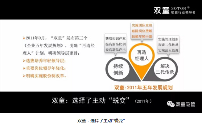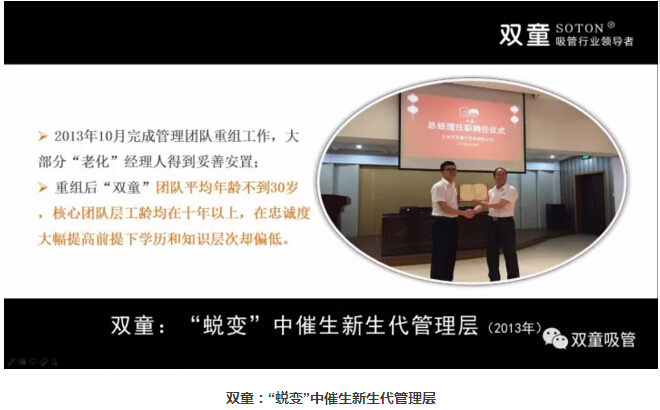 面對這樣的現(xiàn)狀,“雙童”選擇了主動“蛻變”,在2011年發(fā)布了第三個《企業(yè)五年發(fā)展規(guī)劃》,明 確“再造經(jīng)理人”計劃,明確領導層更替:選拔培養(yǎng)年輕領導層、重要崗位領導年輕化、明確實施股份制改革,慢慢解決管理層老化問題!重組后的“雙童”團隊平均年齡不到三十歲,大部分核心團隊的工齡在十年以上,學歷、知識層次和忠誠度大幅提高!