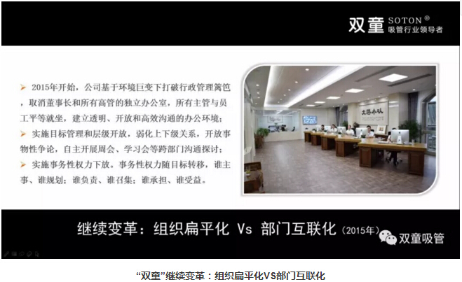基于時代的改變和挑戰(zhàn),“雙童”在2015年對組織形式做出新的變革,打破行政管理籬笆,通過平等、透明、開放的辦公環(huán)境,消除部門之間的隔閡,實施目標管理和層級開放,弱化上下級關系,自主開展周會等跨部門溝通探討,提升部門工作效率。同時,實施事務性權力下放,大家以解決事務為核心,讓權力隨事務轉(zhuǎn)移,誰主事、誰規(guī)劃;誰負責、誰召集;誰承擔、誰受益,一切以工作結(jié)果為導向,也實現(xiàn)了跨部門互通互聯(lián)、共同探討!