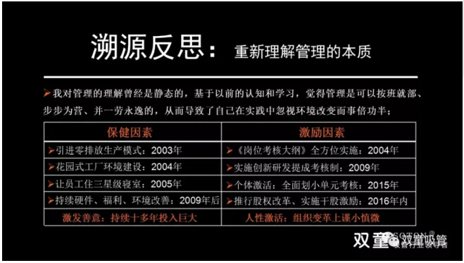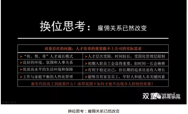 “雙童”經(jīng)歷團隊“蛻變”后,通過學習會意識引導、推動家文化人性管理以及全方位改善員工的生活生產(chǎn)環(huán)境,提升團隊認知意識和凝聚力!經(jīng)歷“蛻變” 后團隊凝聚力確實有所提升,但客觀上基層員工的流動性依然較大,對高端人才引進還是沒有太大吸引力,企業(yè)的持續(xù)發(fā)展明顯存在著天花板瓶頸。