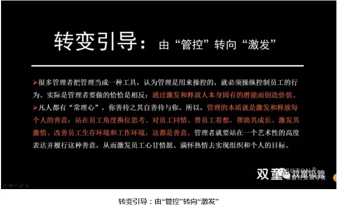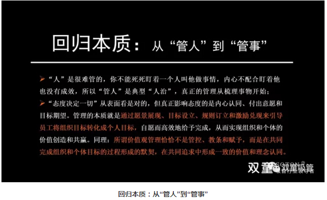 管理的本質(zhì)是“管事”而非“管人”,通過愿景展現(xiàn)、目標設立、規(guī)則訂立和激勵兌現(xiàn)來引導員工將組織目標轉(zhuǎn)化成個人目標,自愿而高效地給予完成,從而實現(xiàn)組織和個體的價值創(chuàng)造和共贏。同時,通過培訓、授權和激勵,激發(fā)和釋放人本身固有的潛能而創(chuàng)造價值。所以,管理的本質(zhì)管理不是管控、教條和賦予,而是在共同完成組織和個體目標的過程形成的默契,在共同追求中形成一致的價值和理念認同。