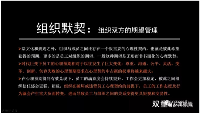 除了文化和規(guī)則之外,組織與成員之間還存在一個很重要的心理性契約,也就是彼此希望獲得的預期,更多的是員工對組織的期望。在心理預期得到有效兌現(xiàn)下,員工的滿意度會持續(xù)提升,工作會更加穩(wěn)定,彼此之間組織信任感會更強。