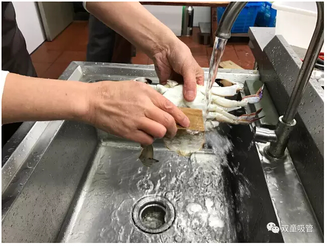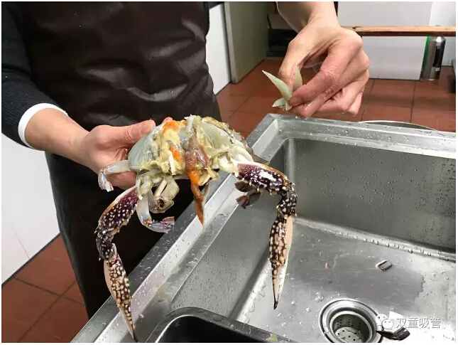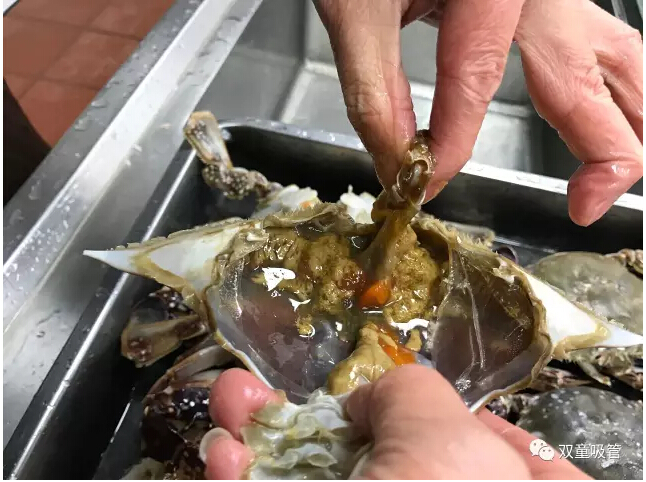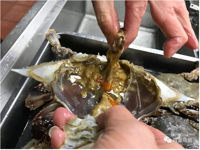 12、取出砂囊后將蟹身兩側(cè)的蟹鰓(看上去像魚鰓)用手工拔除干凈,如果蟹鰓底部有烏黑砂子,千萬不要用清水沖洗,用干凈牙刷局部清洗一下就可以了。