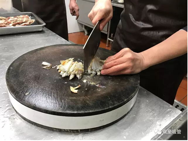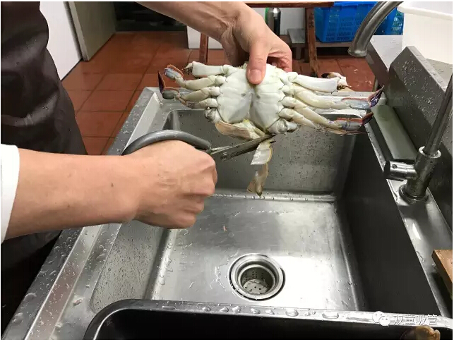 14、再把蟹身切成幾塊。(大點(diǎn)螃蟹切分六塊、小一點(diǎn)螃蟹切分四塊)