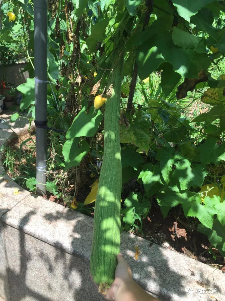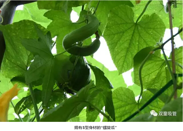 接下來這個瓜可是堪稱藝術品呢!一般的葫蘆瓜都是直筒的,而“雙童”菜園里的葫蘆瓜居然長成了一個名副其實的葫蘆瓜。吸管君直言,把瓜仁挖了,都可以當酒壺啦!