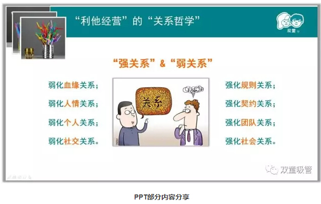 >>>> “利他經(jīng)營(yíng)”的“關(guān)系哲學(xué)”:企業(yè)如何通過引導(dǎo)讓關(guān)系達(dá)到最優(yōu)配置?“雙童”樓仲平十分注重關(guān)系哲學(xué),通過弱化血緣關(guān)系,強(qiáng)化規(guī)則關(guān)系;弱化人情關(guān)系,強(qiáng)化契約關(guān)系;弱化個(gè)人關(guān)系,強(qiáng)化團(tuán)隊(duì)關(guān)系;弱化社交關(guān)系,強(qiáng)化社會(huì)關(guān)系,從而為企業(yè)持續(xù)發(fā)展創(chuàng)造良好條件!