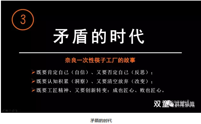 >>>> “矛盾”的時(shí)代:“雙童”樓仲平通過日本奈良一次性筷子的故事告訴大家成也工匠精神、敗也工匠精神,沒有改變,“工匠”精神也沒有用。作為創(chuàng)業(yè)者來講,我們不能用過往的經(jīng)驗(yàn)來理解發(fā)生的一切,否則你會(huì)被時(shí)代所拋棄。在不同的時(shí)代,你對(duì)時(shí)間和技術(shù)進(jìn)步的理解是不一樣的,既要肯定自己、又要否定自己;既要認(rèn)知積累、又要清空放棄;既要工匠精神、又要?jiǎng)?chuàng)新轉(zhuǎn)變!
