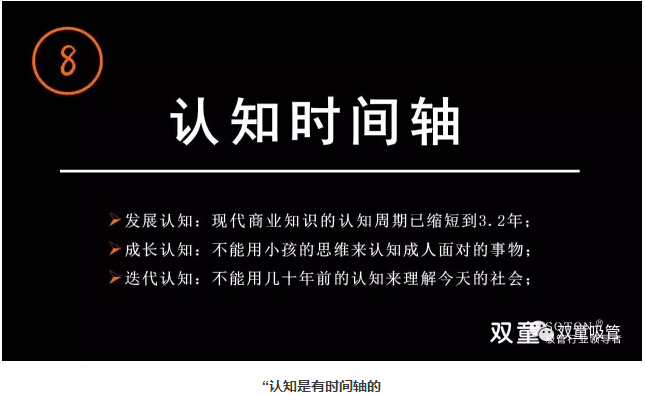 >>> “認(rèn)知”時(shí)間軸:現(xiàn)代商業(yè)知識(shí)的認(rèn)知周期已縮短到3.2年,我們不能用小孩的思維來認(rèn)知成人面對(duì)的事物,更不能用幾十年前的認(rèn)知來理解今天的社會(huì)。每個(gè)人的成長(zhǎng)伴隨著不斷的否定,在認(rèn)知、糾錯(cuò)、不斷改變下實(shí)現(xiàn)自我成長(zhǎng)。“創(chuàng)業(yè)者”最應(yīng)該有“時(shí)間軸”的概念,需要擁有自我蛻變的能力,否則你就很難成長(zhǎng),我們應(yīng)該拋棄固有的認(rèn)知,保持終身學(xué)習(xí),建立與年輕人溝通與對(duì)話的能力,不斷認(rèn)知升級(jí)接受不斷變化和挑戰(zhàn),迎合這個(gè)時(shí)代的發(fā)展!