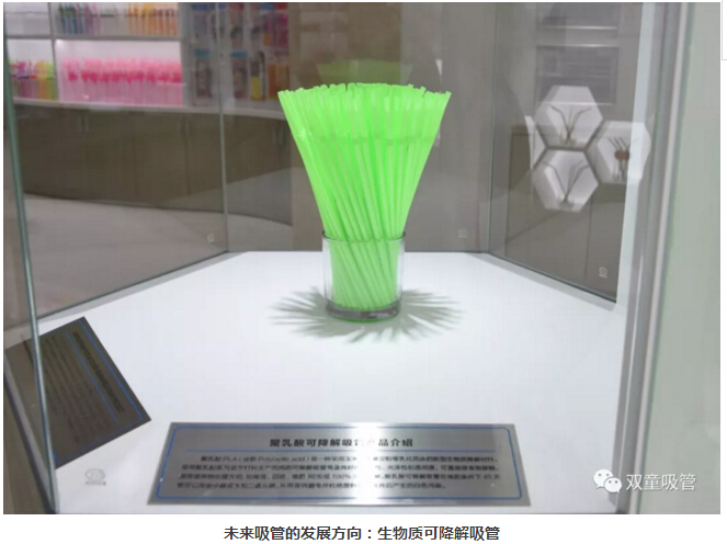 值得關注的是,博物館中還陳列著“雙童”研發(fā)的聚乳酸可降解吸管。這種吸管由玉米或淀粉乳化而成,在堆肥條件下45天就可以分解為水和二氧化碳,有效地避免了塑料制品所造成的白色污染問題。但由于聚乳酸等可降解材料的原料價格過于昂貴,客觀上會受成本過高的限制,過高的產(chǎn)品售價暫時還難以被市場和消費者大范圍接受。但是,我們堅信,這一定是吸管行業(yè)未來發(fā)展和研究的主要方向!