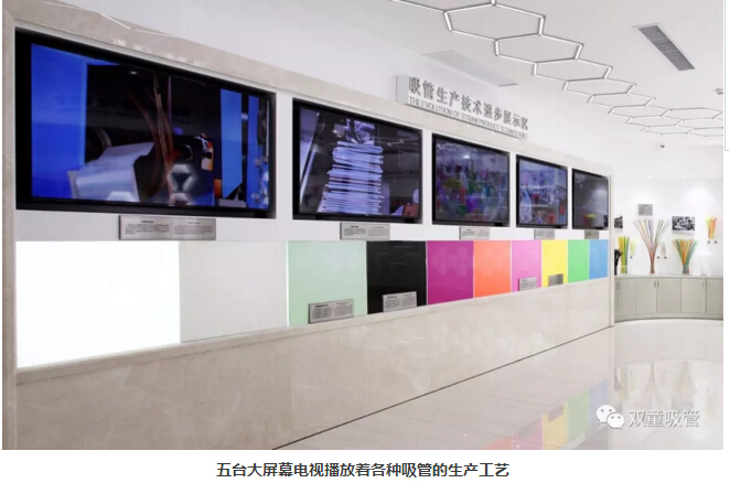 由于現(xiàn)代塑料吸管的生產(chǎn)設備過于龐大,不能一一將設備陳列在博物館現(xiàn)場。所以在吸管生產(chǎn)技術展示區(qū)內(nèi)采用了五臺三星55寸大屏幕電視用于展播各類吸管的生產(chǎn)工藝。每臺電視機各播放一種吸管的生產(chǎn)工藝,大家在觀看的過程中能非常直觀的感受到現(xiàn)代吸管的生產(chǎn)技術和生產(chǎn)工藝。